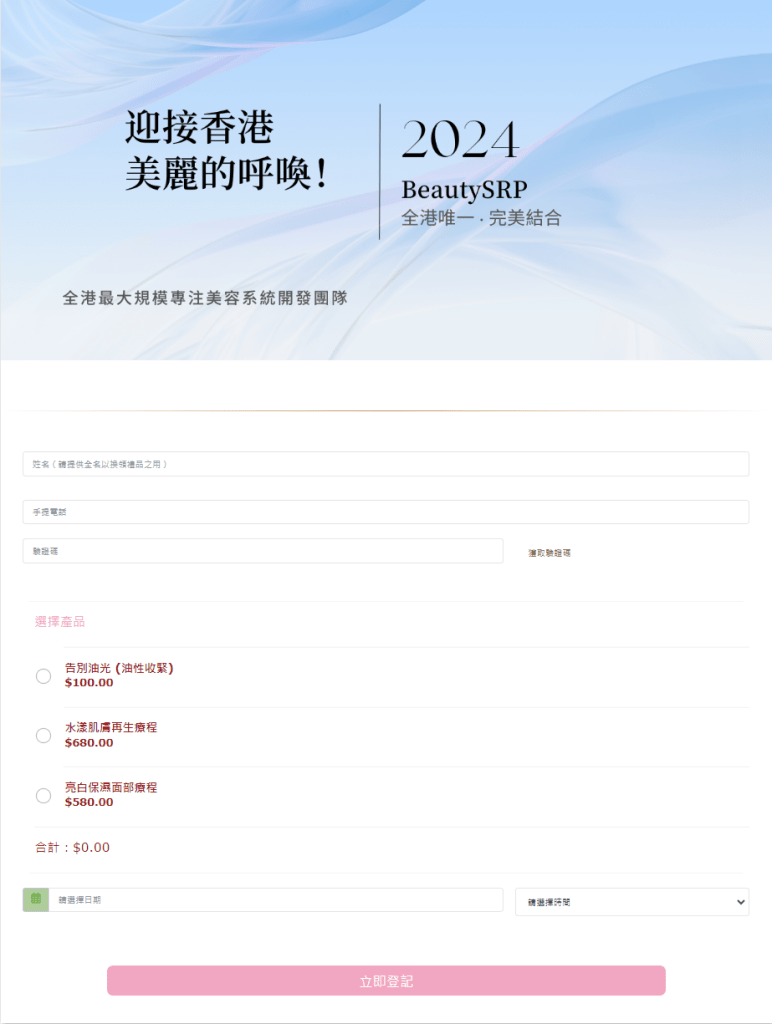 BeautySRP幫到您,BeautySRP提供極之強大的SRP線上表格,我地自己叫佢做"神之表格",因為佢太百撘啦,配合SRP的其他推廣功能,真係可以做出千變萬化既銷售推廣應用,唔好講太遠,今次主要講返線上收款及預約,大家可以參考下圖