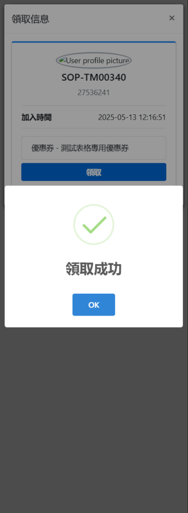 Step 7: 輸入之後會顯示該優惠券的名字跟領取按鈕,點擊領取就可以領取成功了,再次使用該券碼領取會顯示券碼已使用